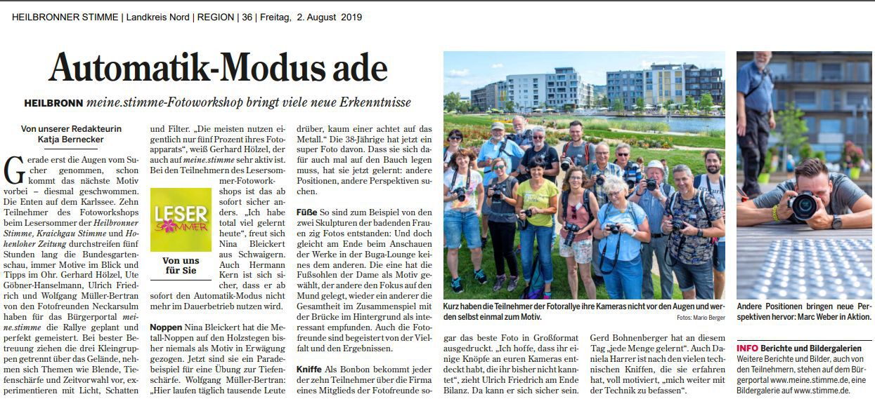 Mit meinen Kollegen  der "Fotofreunde Neckarsulm" Ute Göber-Hanselmann,Uli Friedrich und Wolfgang Müller-Bertran und den Teilnehmern vom Lesersommer der HST wurde eine Fotorallye auf der Buga durchgeführt. Die Aktion wurde wurde von Frau Katja Bernecker  aus der meine.Stimme Redaktion hervorragend betreut.
