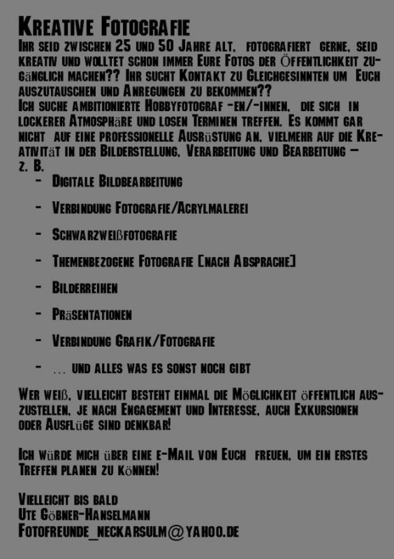 Mittels Flyern, die in Neckarsulm auslagen, fanden sich zum ersten Treffen gerade einmal 3 Personen ein. Einer davon war Wolfgang Müller-Bertran, der schon viele Fotokurse in der Volkshochschule Neckarsulm belegt hatte und somit Kontakt zu anderen Hobbyfotografen hatte.